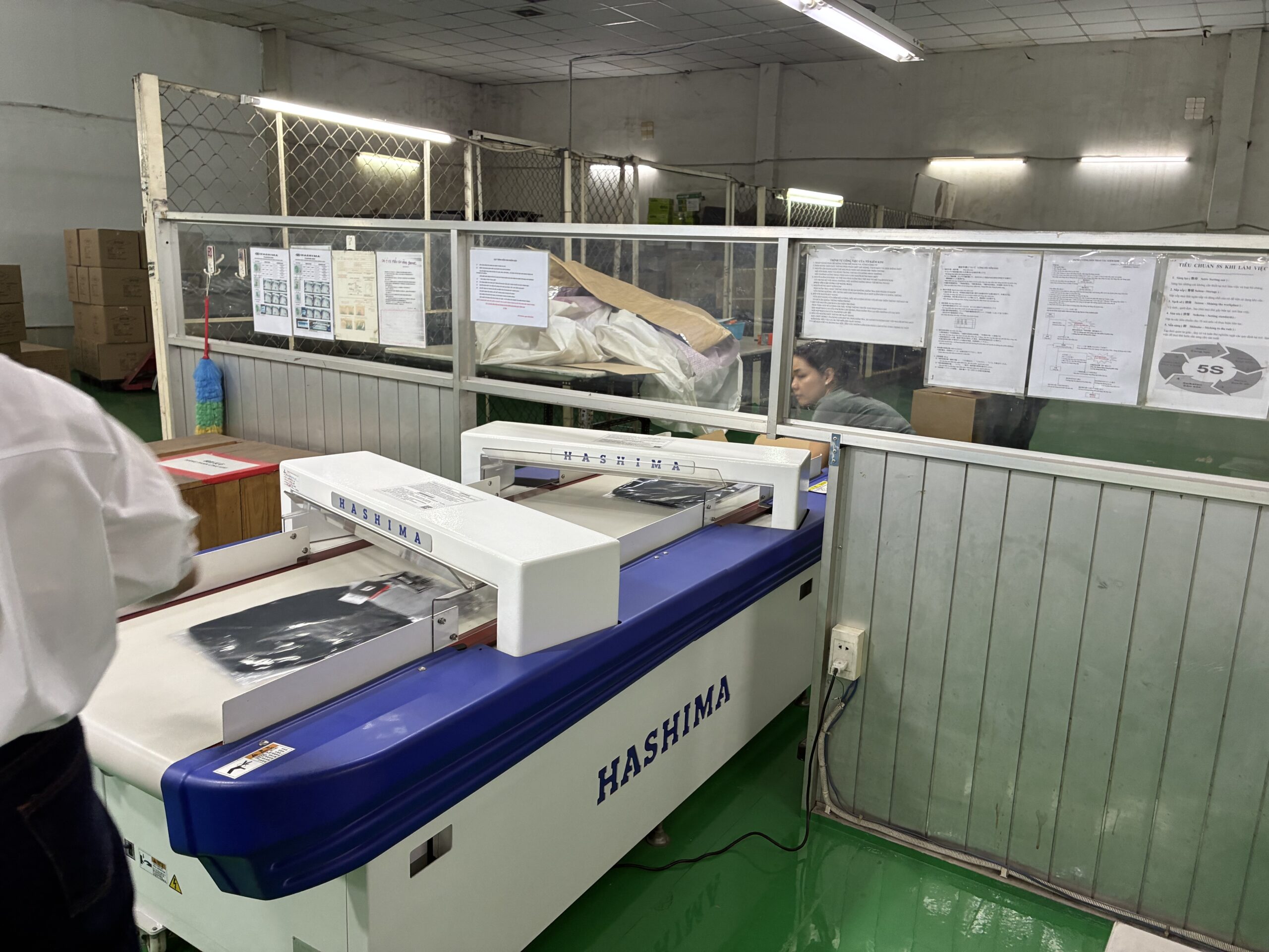縫製されるため、ミシン針が折れて製品内に残る場合があります。検針機を使い針を見つける作業です。
